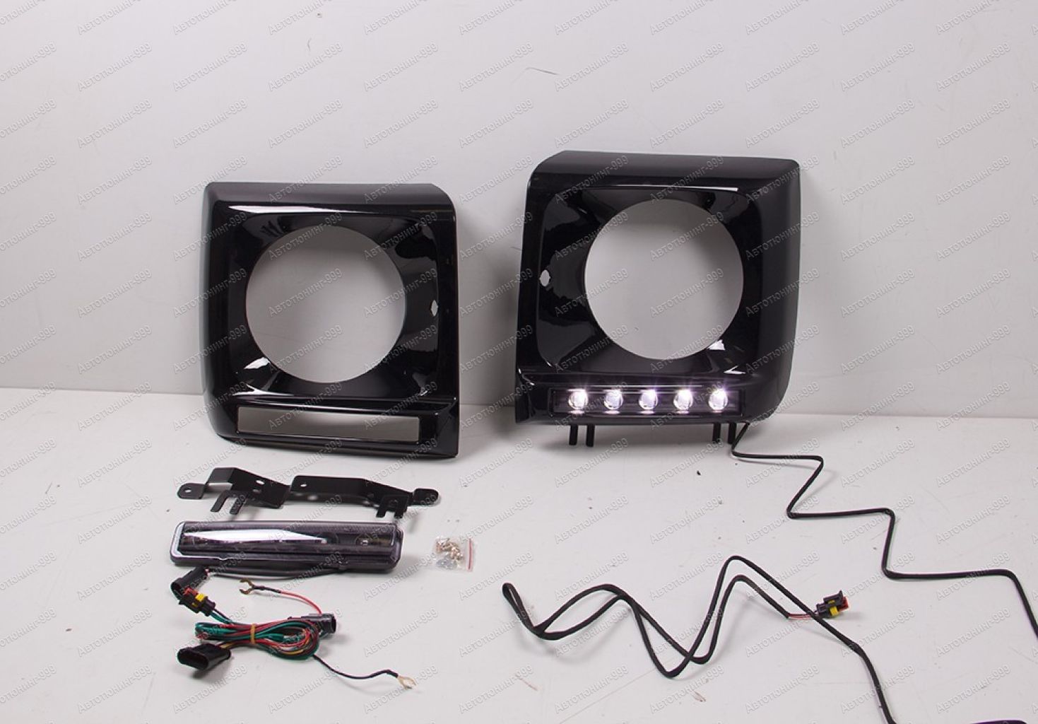 Комплект рестайлинговых деталей от Mercedes G-Class. В комплекте рамки передних фар с прорезями для установки светодиодных модулей, 2 LED модуля дневного света и 2 крепежные планки для модулей. Весь комплект устанавливается на штатные крепления.