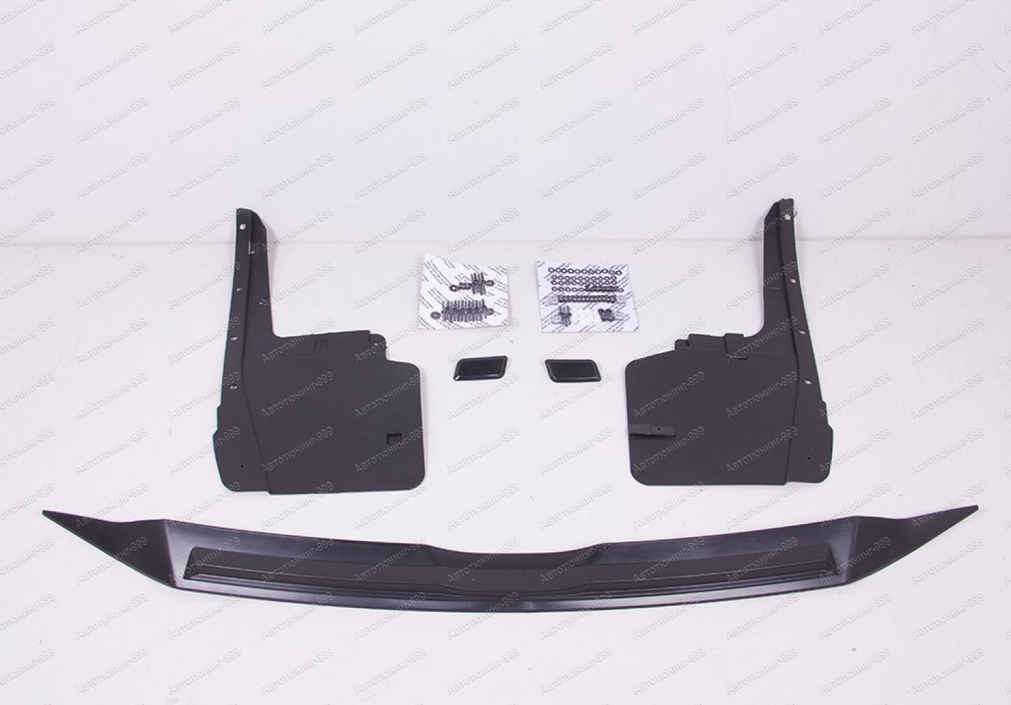 В комплект входит передний бампер в сборе, передние крылья, капот, петли капота, решетка радиатора, фары, крепления для фар, задняя крышка багажника, фонари, задний бампер в сборе и весь необходимый крепеж для монтажа.